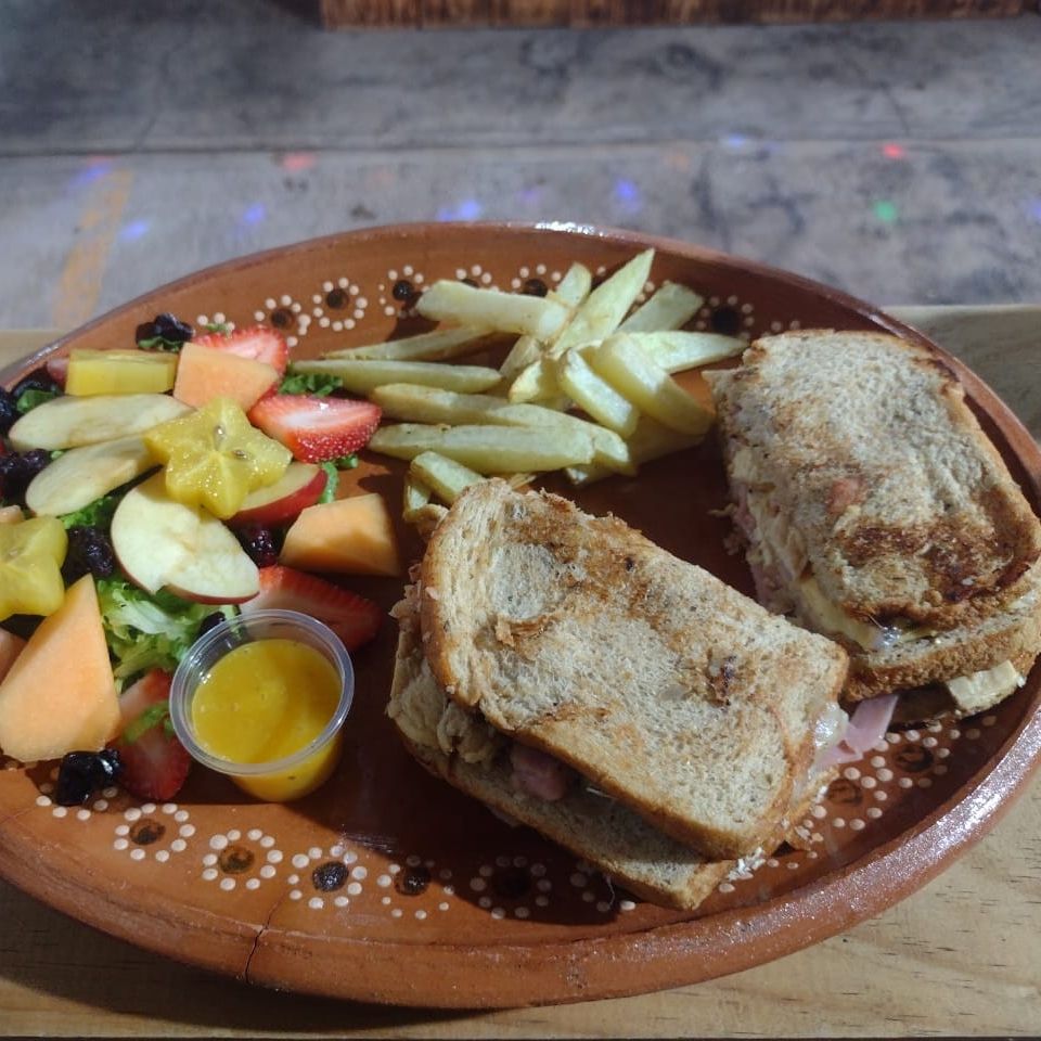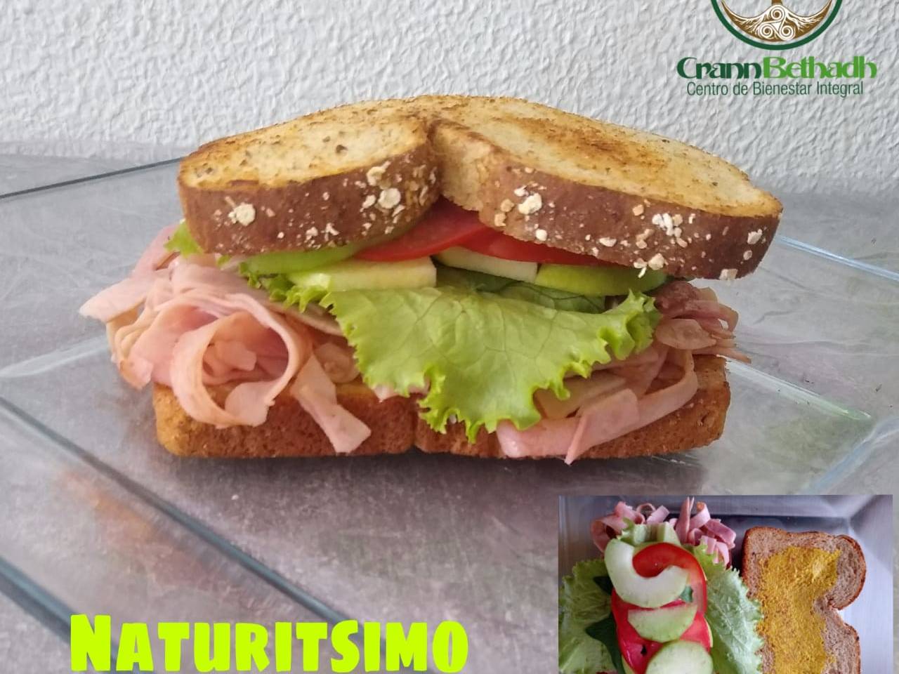 Tiras de jamón de pierna entre dos panes de 12 granos de pan Oroweat, jitomate, lechuga, manzana, pepino y mostaza opcional; queso chihuahua derretidol. Este platillo es rico en fibra y bajo en grasa por lo que favorece la digestión y tiene alto contenido de ácido fólico. Se sirve con 2 guarniciones