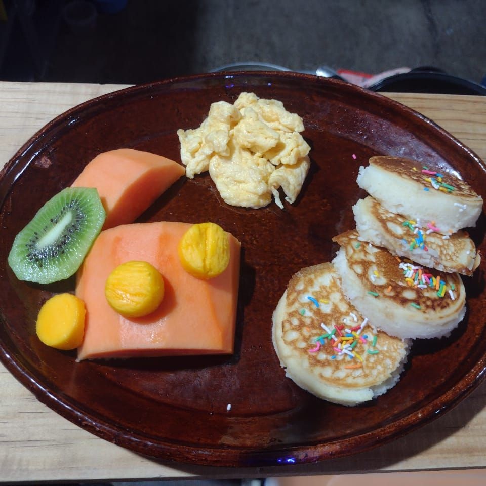 4 Hotcakes dolar, huevito revuelto y un cofre de fruta de la estación. Platillo ideal para los peques