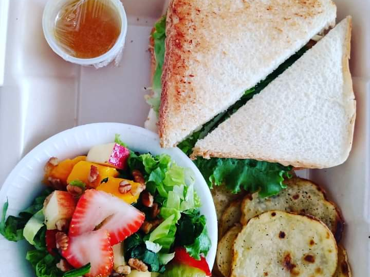 Sandwichito de pechuga de pollo con queso panela, jitomate, pepino y lechuga. Mostaza opcional. Papitas Naturitsimo y Ensalada Paradise. Aderezos y guarniciones sujetas a disponibilidad del restaurnte (Imagen Ilustrativa)