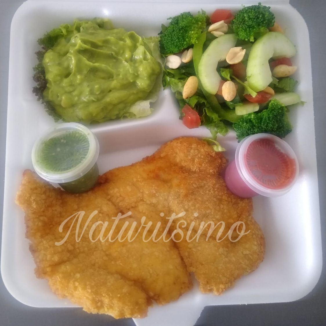 Milanesa de pollo, acompañada con dos guarniciones, salsa y tortillas, ideal para satisfacer tu hambre