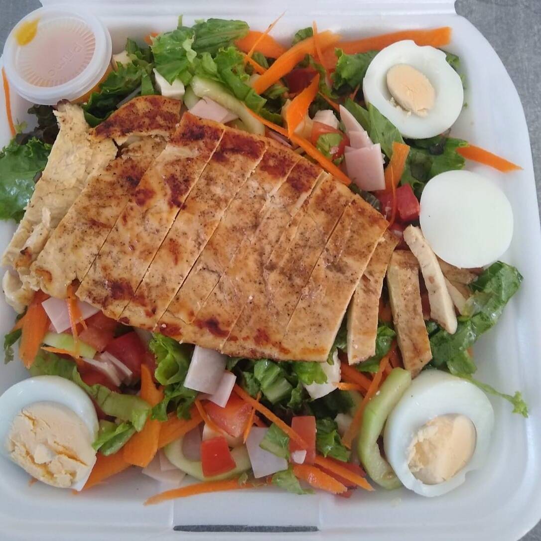 Mezcla de lechuga con espinacas, jitomate, pepino, zanahoria, jamón de pierna, queso panela, queso manchego, pechuga de pollo y huevo cocido. Una comida con alto contenido proteíco y propiedades antioxidantes.
