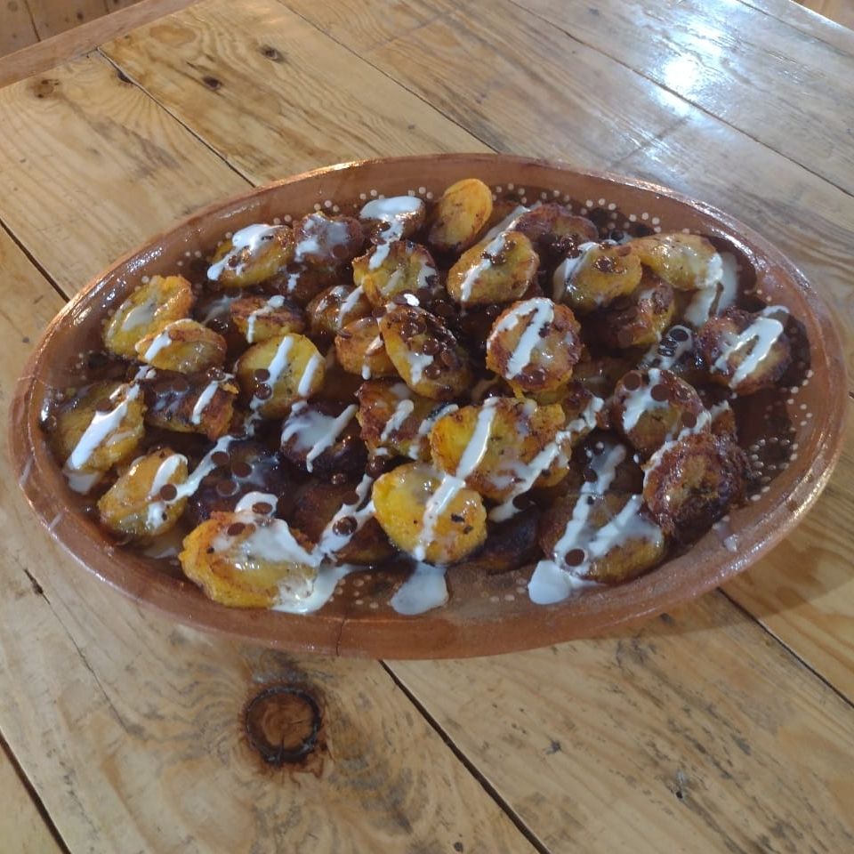 Platanitos fritos con crema, mermelada, lechera y chispas de chocolate. Para darte un dulce gusto