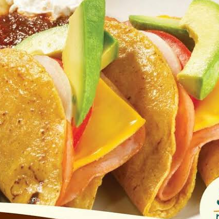 Quesadillas fritas (3) de jamón, queso oaxaca y queso amarillo. Se sirven con lechuga, jitomate y aguacate. Una guarnición del día incluida