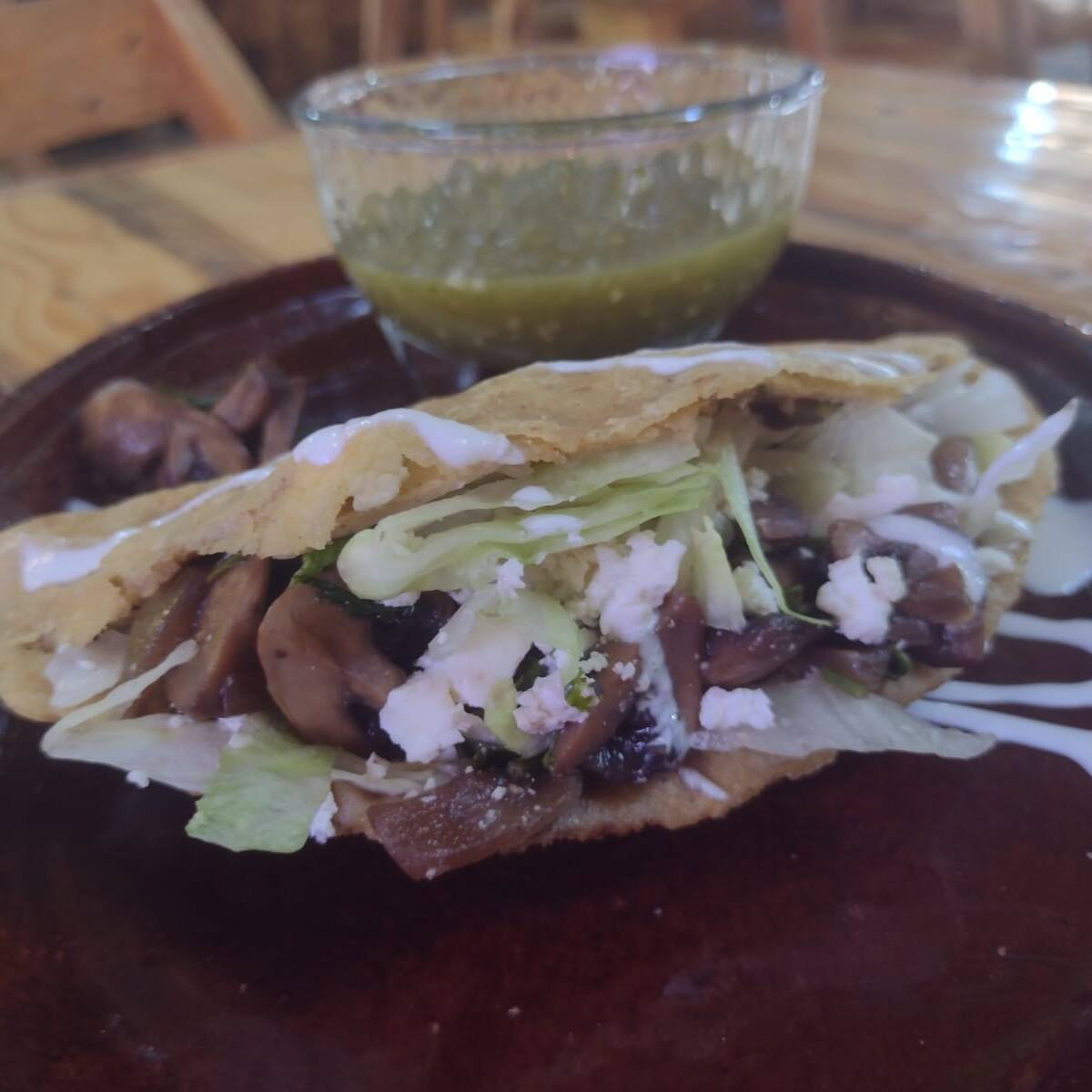 Quesadilla frita de champiñones con queso oaxaca, se sirve con lechuga, crema, queso y salsa.