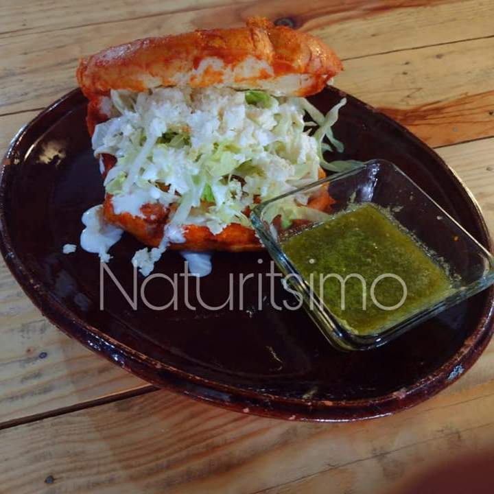 Pan tradicional bañado en salsa roja de la casa, relleno de papa con chorizo. Se sirve con lechuga, crema, queso y salsa aparte.