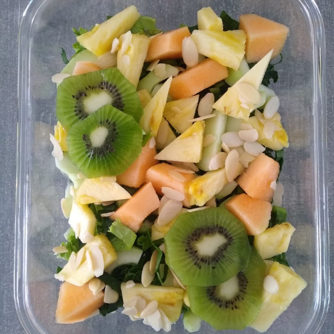 Mezcla de lechuga con espinacas, melón, piña, pepino, almendras y kiwi. Sin duda una ensalada fresca y revitalizante.