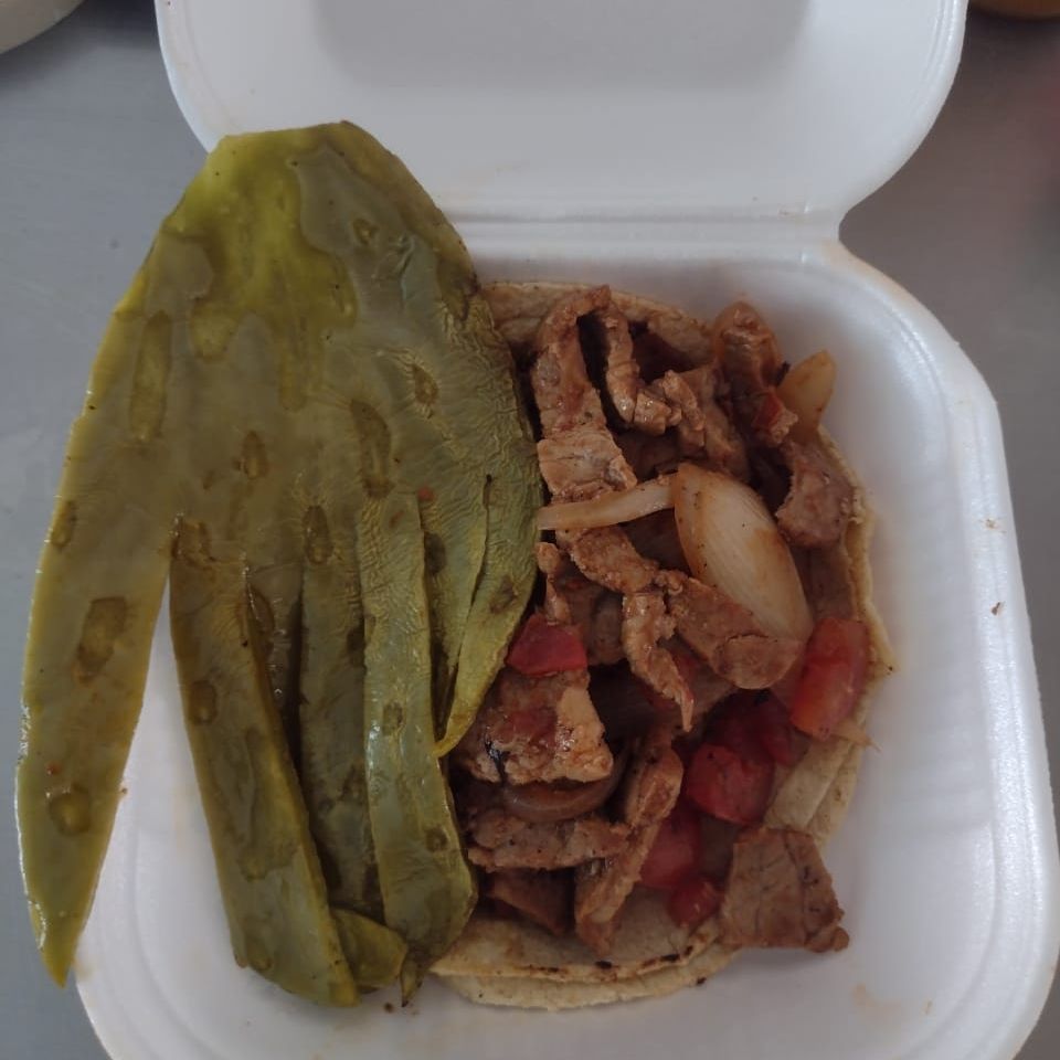 Tortilla hecha a mano, bistec de res y nopal. Se sirve con salsa, limón y cebollas caramelizadas.