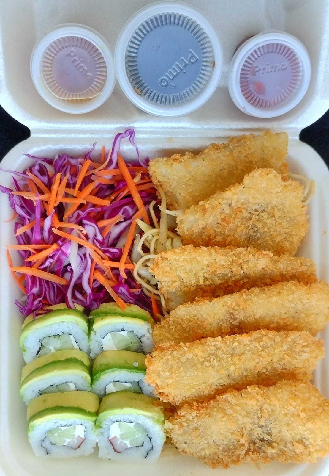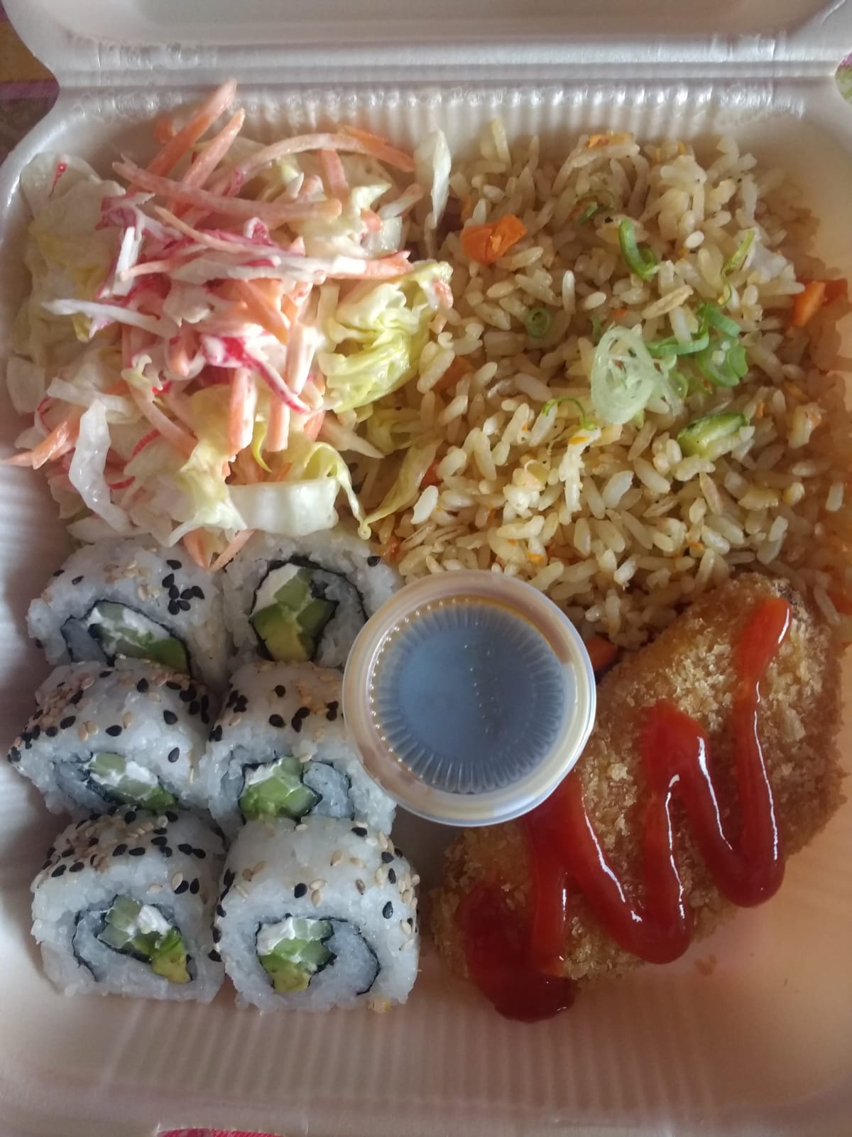 6 BOCADOS DE ROLLO DE SUSHI (ESCOGER UNA OPCION DE ROLLO) YAKIMESHI DE VERDURAS, 1 PZA DE KUSHIAGUE DE QUESO Y ENSALADA DE LECHUGA