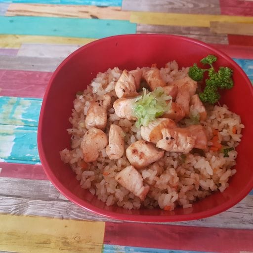 POLLO BAÑADO EN SALSA TERIYAKI ACOMPAÑADO DE ARROZ AL VAPOR Y ENSALADA DE LECHUGA