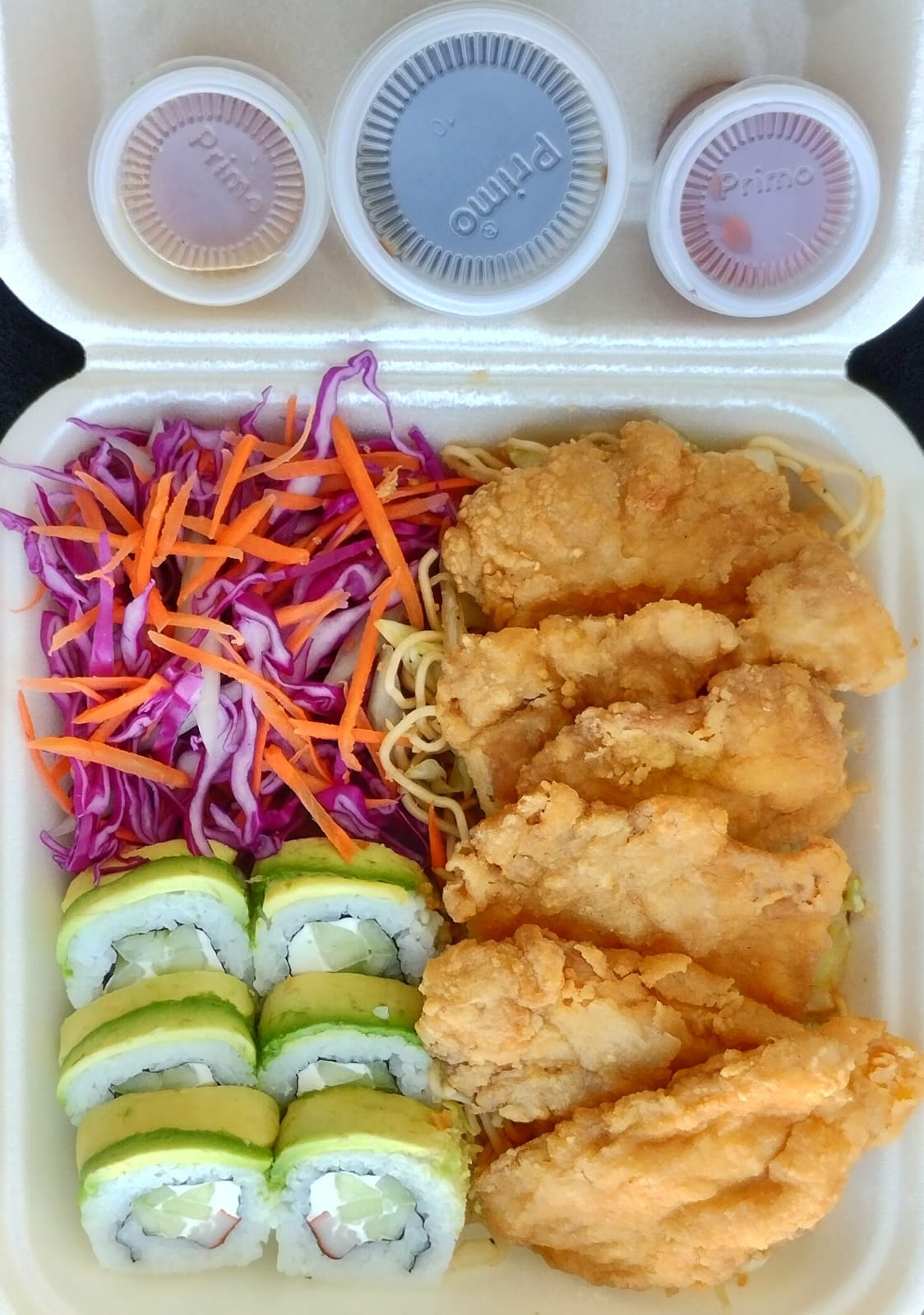 Pescado empanizado sobre una cama de pasta y col salteada, ensalada de col morada y 6 bocados de rollo de sushi (escoger una opción)