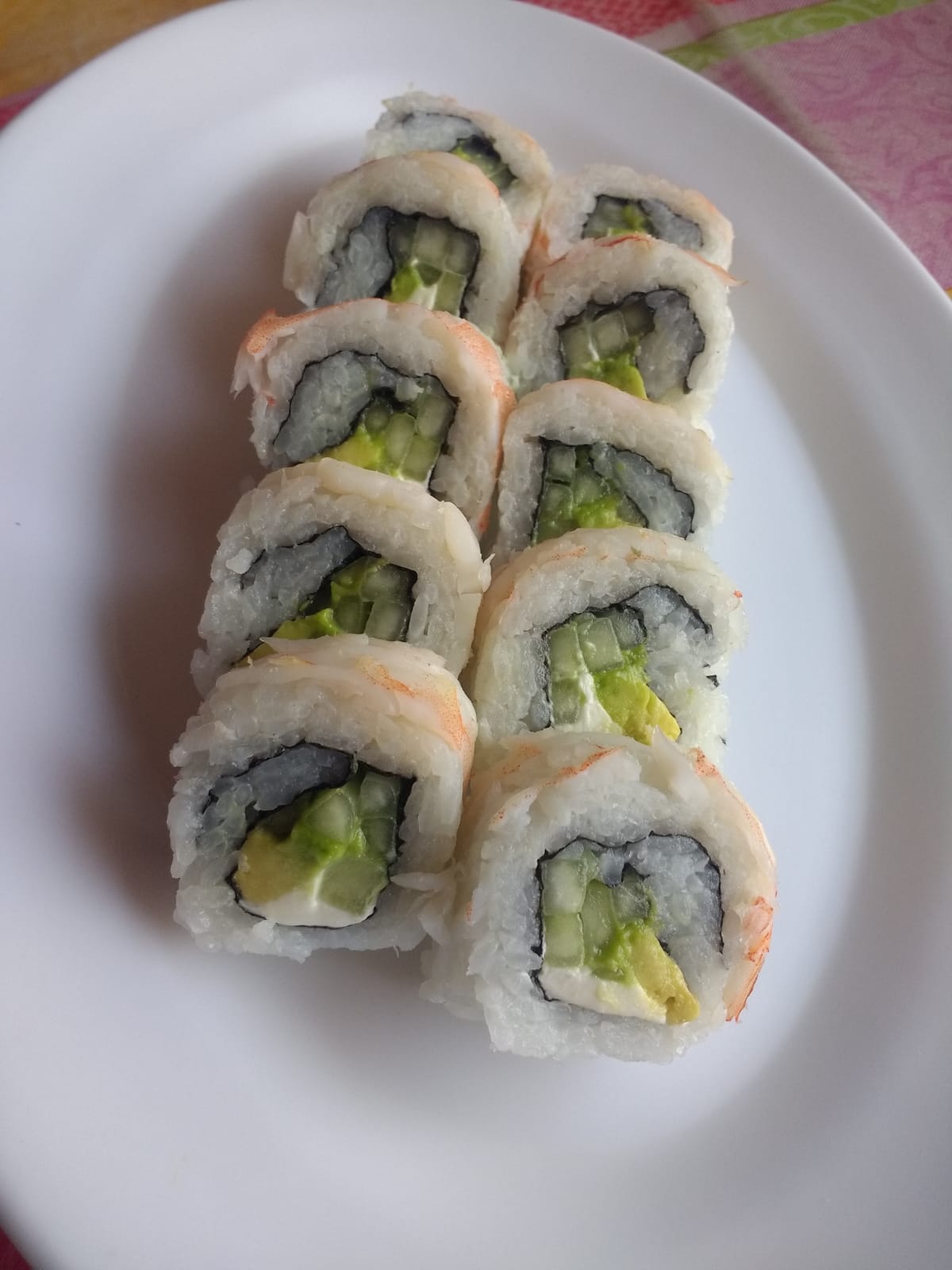 POR FUERA CAMARON, RELLENO DE AGUACATE, QUESO CREMA Y PEPINO