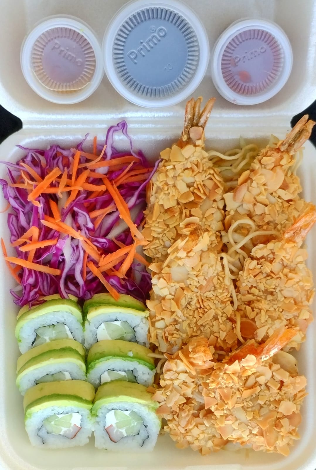 Camarones empanizados sobre una cama de pasta y col salteada, ensalada de col morada y 6 bocados de rollo de sushi (escoger una opción)