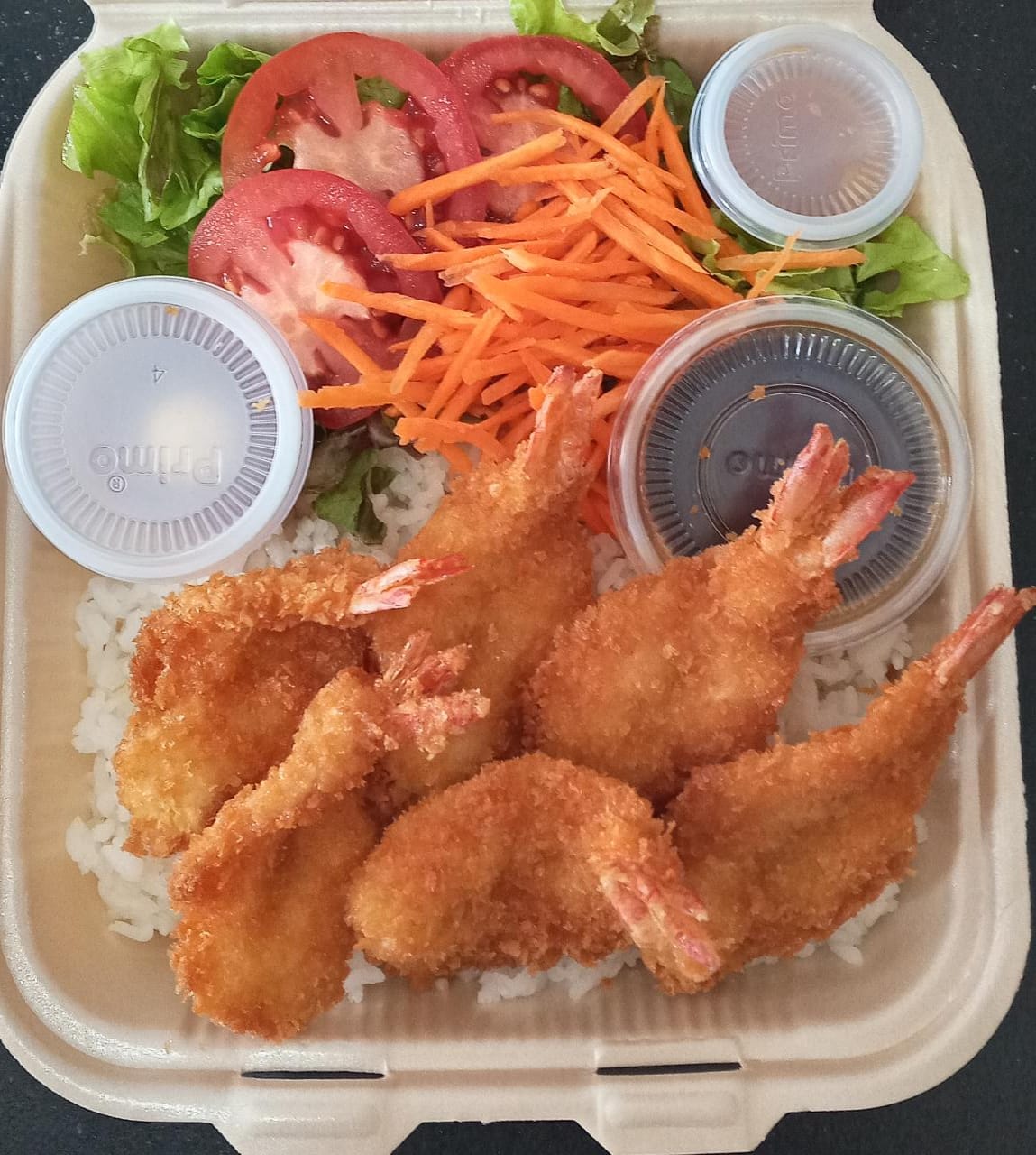 CAMARONES EMPANIZADOS ACOMPAÑADOS DE ARROZ AL VAPOR Y ENSALADA DE LECHUGA