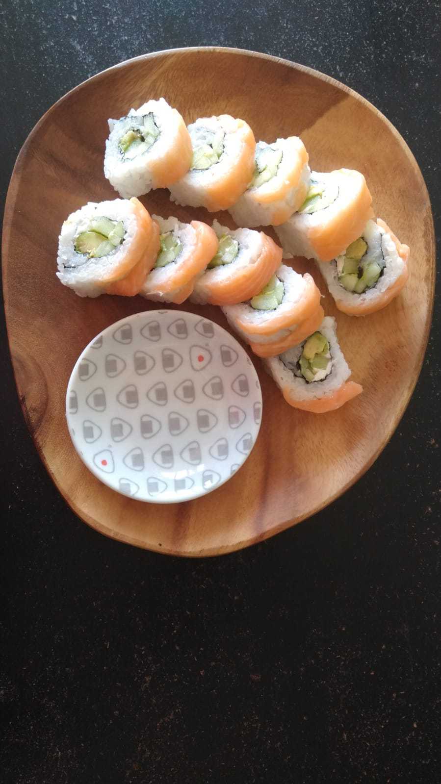 POR FUERA SALMON, RELLENO DE AGUACATE, PEPINO Y QUESO CREMA