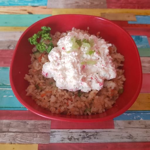 CAMARON, SALMON, CANGREJO, PEPINO, AGUACATE, QUESO CREMA Y PASTA TAMPICO, SOBRE UNA CAMA DE ARROZ PREPARADO