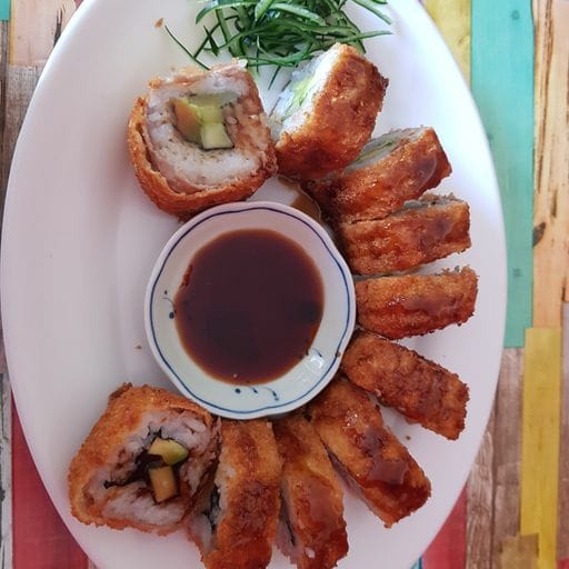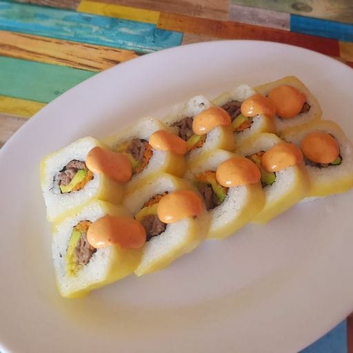 ROLLO EMPANIZADO JUNTO CON RES, RELLENO DE AGUACATE, QUESO GOUDA Y CEBOLLIN, ACOMPAÑADO DE SALSA DE ANGUILA