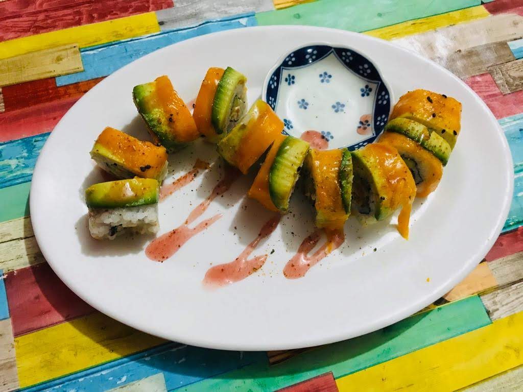 POR FUERA MANGO Y AGUACATE, RELLENO DE CAMARON EMPANADO, PEPINO Y PASTA DRAGON, ACOMPAÑADO DE SALSA DE FRESA