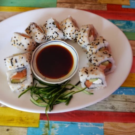 POR FUERA AJONJOLI, RELLENO DE CAMARON, O CANGREJO, O SALMON, PEPINO Y QUESO CREMA