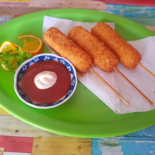 QUESO GOUDA POR FUERA, RELLENO DE RES, AGUACATE Y ZANAHORIA, ACOMPAÑADO DE SALSA CHIPOTLE