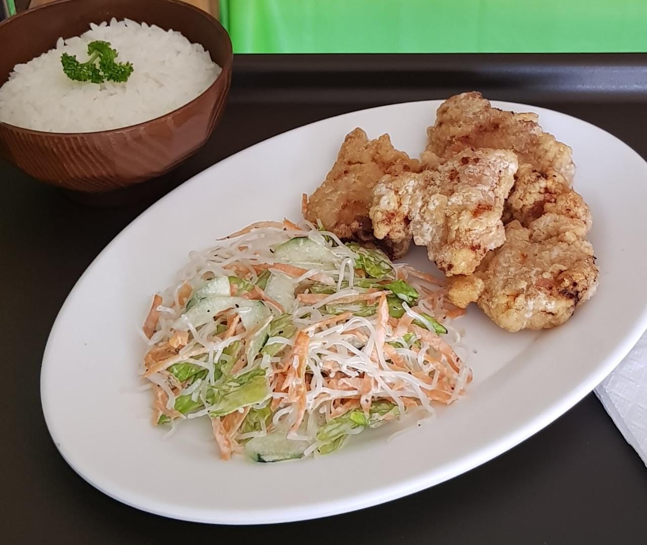 Pollo marinado y frito, sobre una cama de pasta y col salteada, ensalada de col morada y 6 bocados de rollo de sushi (escoger una opción)