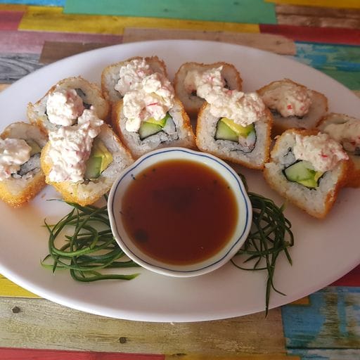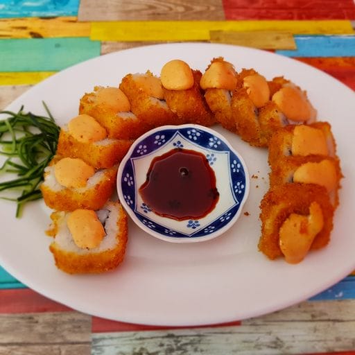 ROLLO EMPANIZADO JUNTO CON QUESO GOUDA, RELLENO DE CANGREJO, QUESO CREMA Y PEPINO, ACOMPAÑADO DE SALSA CHIPOTLE