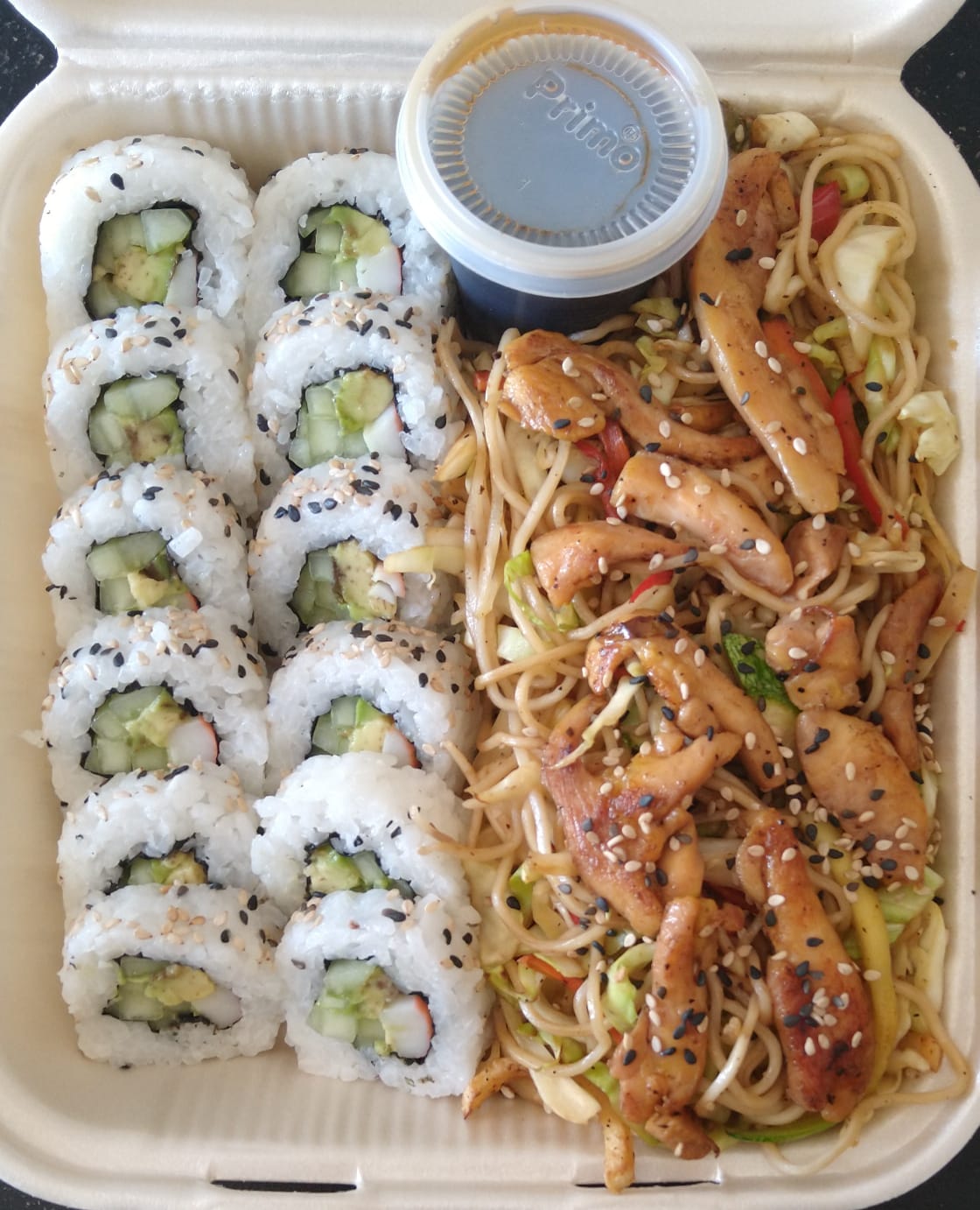 12 BOCADOS DE ROLLO DE SUSHI (ESCOGER UNA OPCION DE ROLLO) YAKISOBA (ESCOGER DE POLLO O RES)