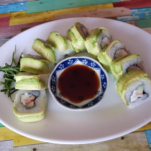 POR FUERA AGUACATE, RELLENO DE CAMARON, O CANGREJO, O SALMON, QUESO CREMA Y PEPINO