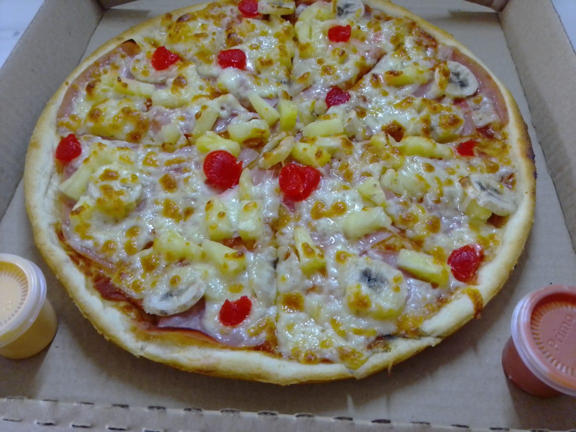 Pizza de 8 rebanadas de jamón, piña, cereza, plátano y extra queso Chihuahua con queso manchego.