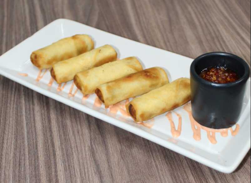 Orden de 5 rollos rellenos de vegetales acompañados de salsa santai.