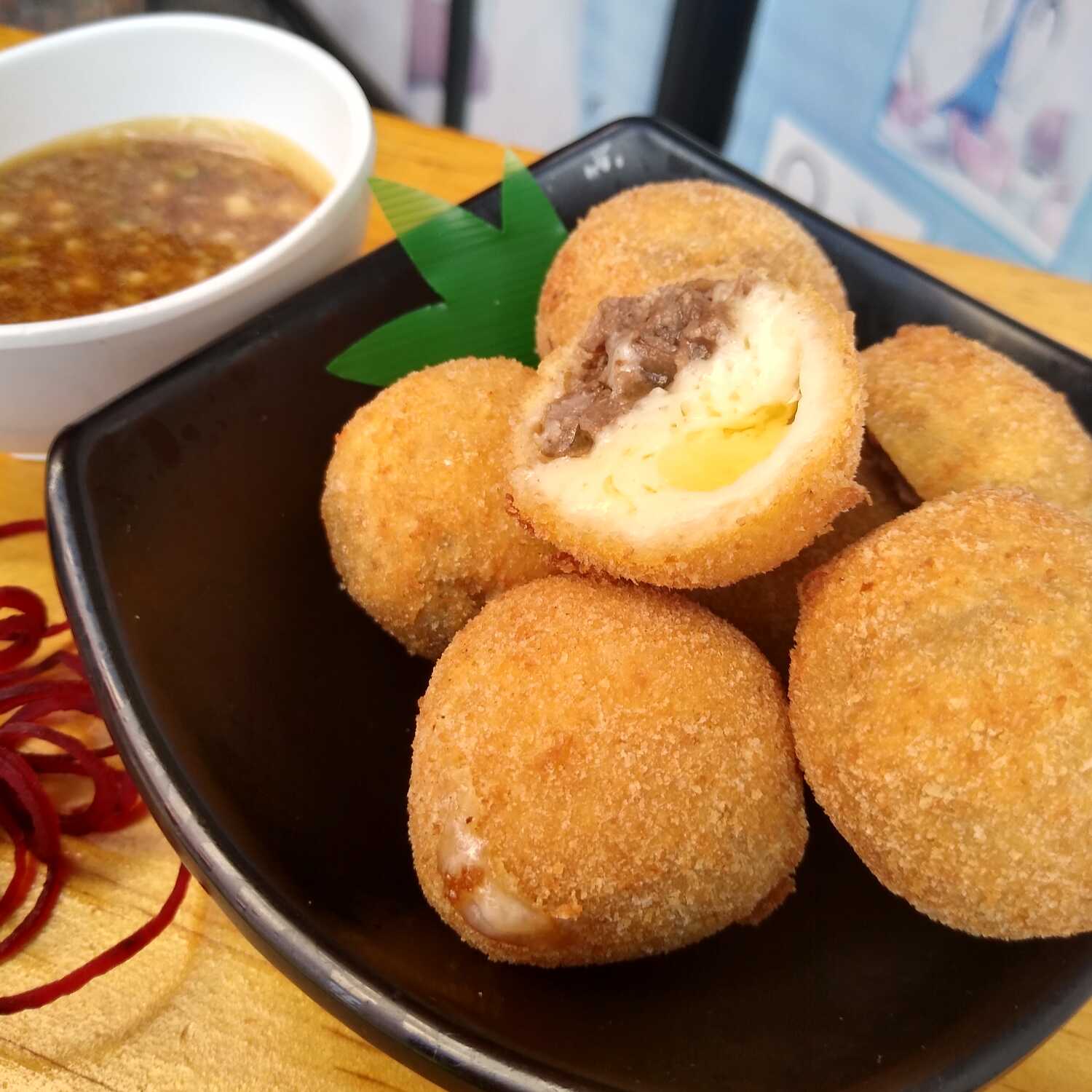 Bolitas empanizadas rellenas de queso gouda y res asada a la japonesa y salsa Zai