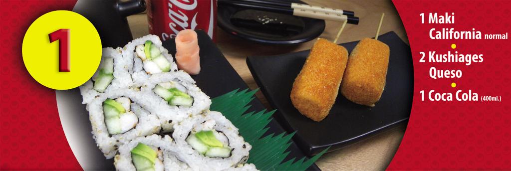 1 Maki California Normal (aguacate, pepino y camarón) + 2 Kushiagues de Queso + 1 Refresco de sabor 355ml