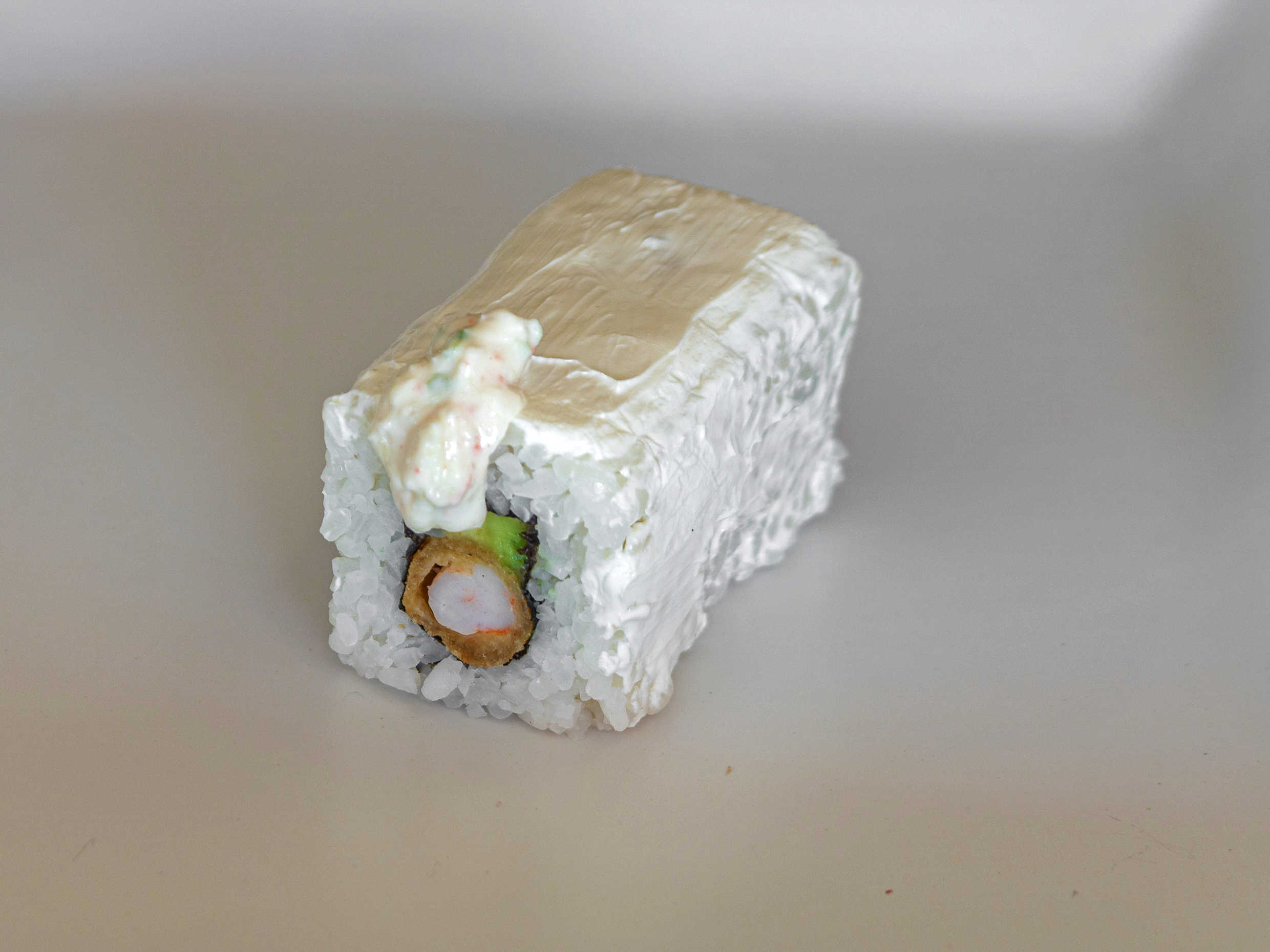 Bola gigante de arroz empanizado con Kakiage frito, filadelfia, pepino, aguacate, salsa dulce de soya