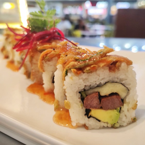 Res y pollo asados a la japonesa, furikake ebi, aguacate, filadelfia, pepino y salsa tampico.