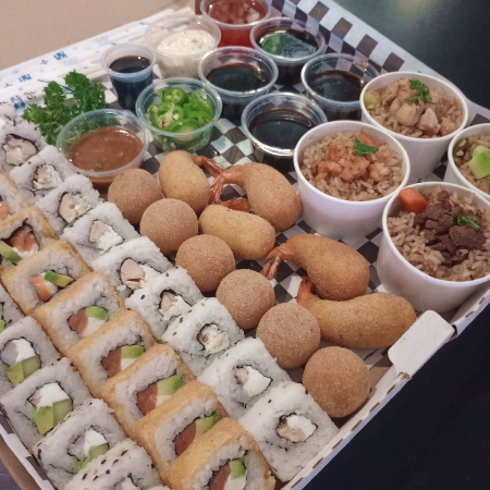 1 Maki California (aguacate, pepino, camarón y filadelfia), 1 Doña Julia (empanizado con manchego, aguacate, salmón ahumado, filadelfia y salsas de anguila y tampico), 1 maki Tori Sencillo (pollo asado y filadelfia), 4 Mini Yakimeshis verduras, 1 Perlas Mari Jane (6 bolitas empanizadas con queso, res y salsa Zai), 1 Chonchos (5 camarones empanizados con fila y s.spring)