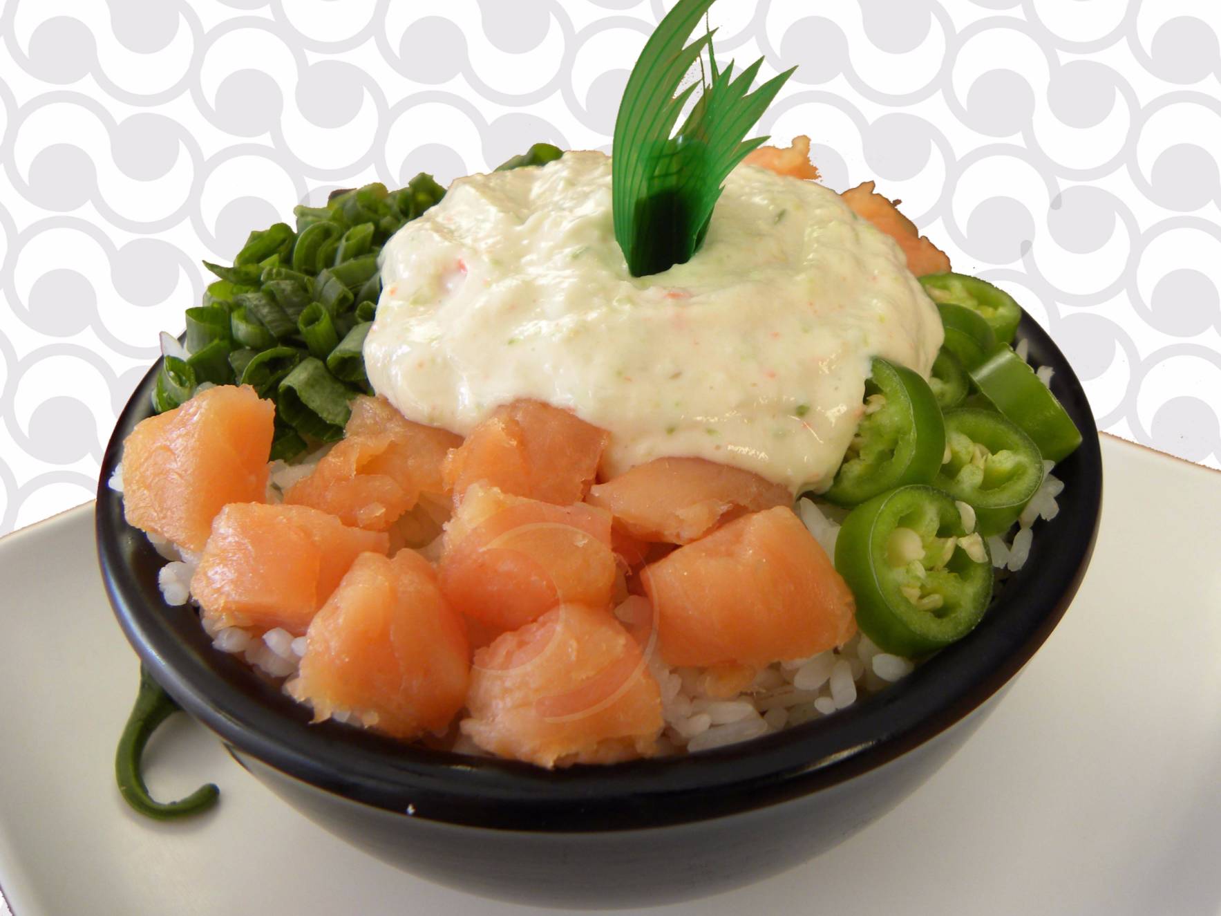 Trocitos de salmón ahumado, tampico, cebollín y chiles toreados sobre una cama de gohan