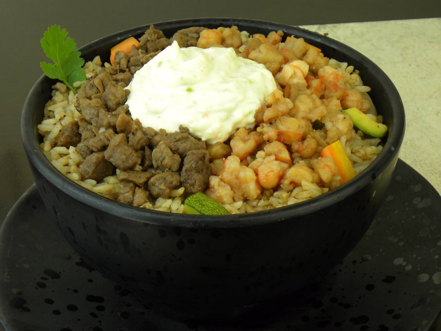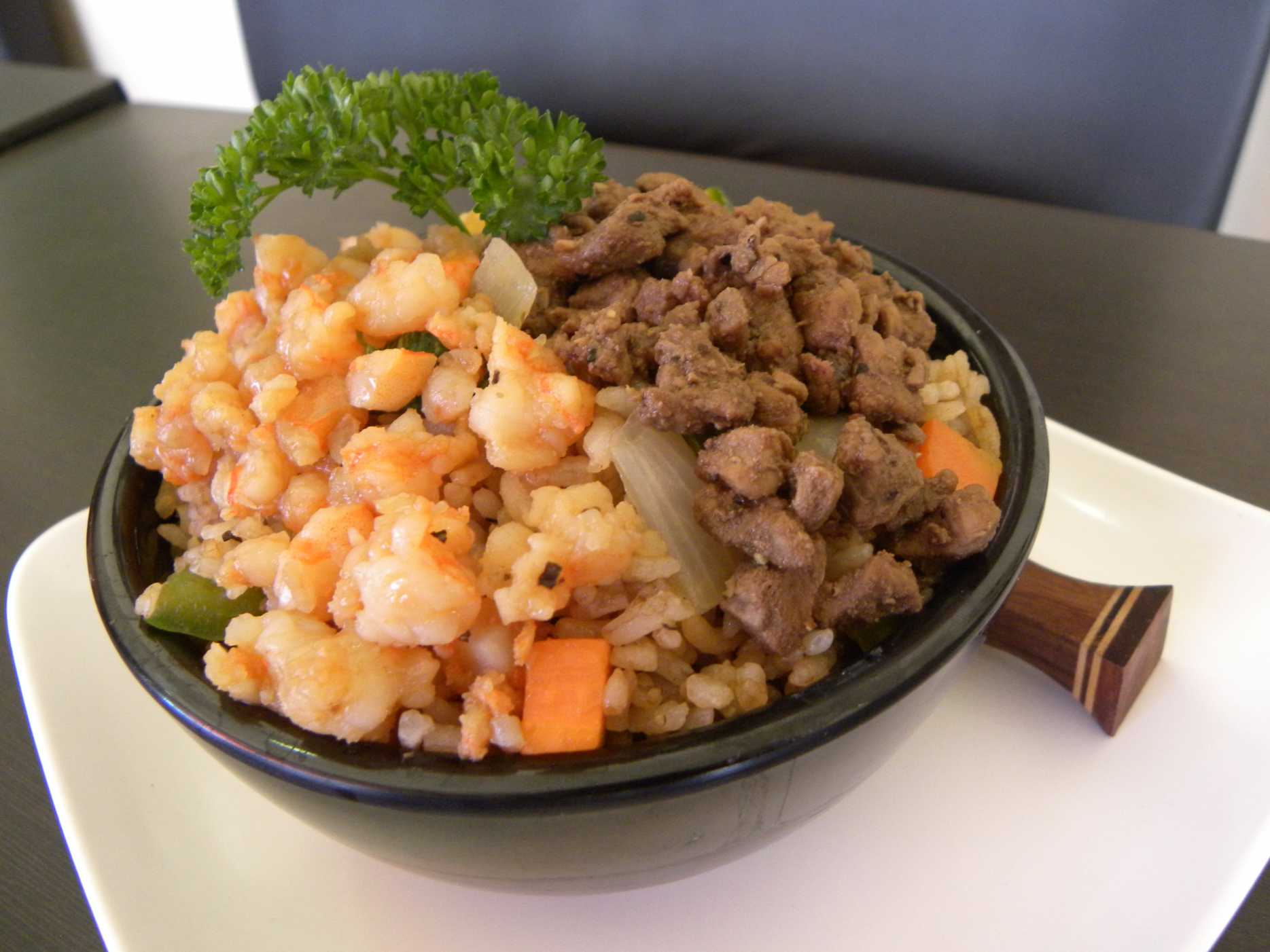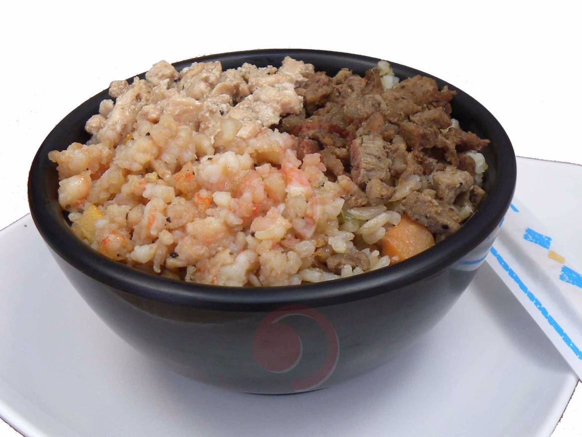 Yakimeshi con res, pollo y camarón asados a la japonesa