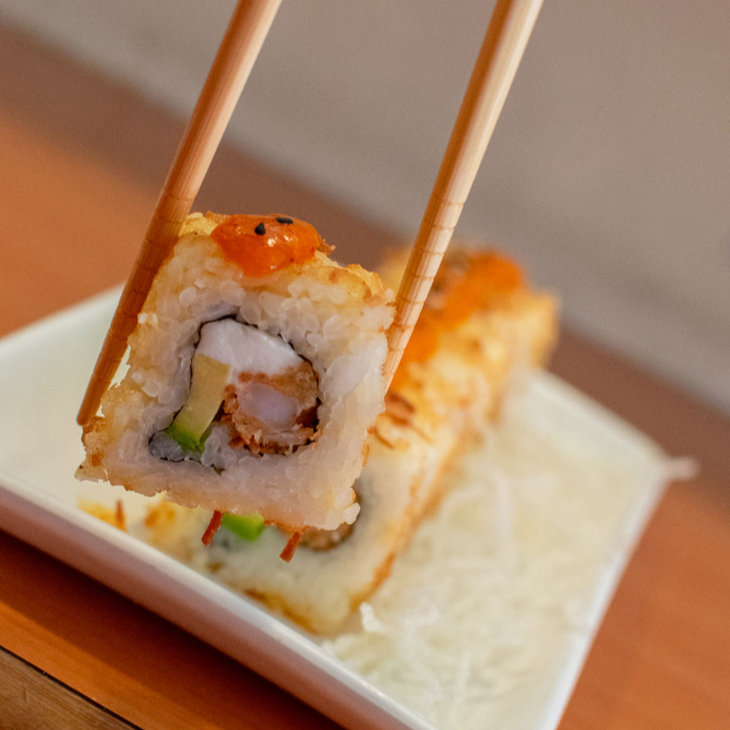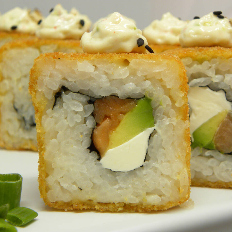 Aguacate, salmón ahumado y cangrejo por fuera, camarón empanizado, pepino y queso filadelfia por dentro. Salsas Tampico, kushiage y chiptole.