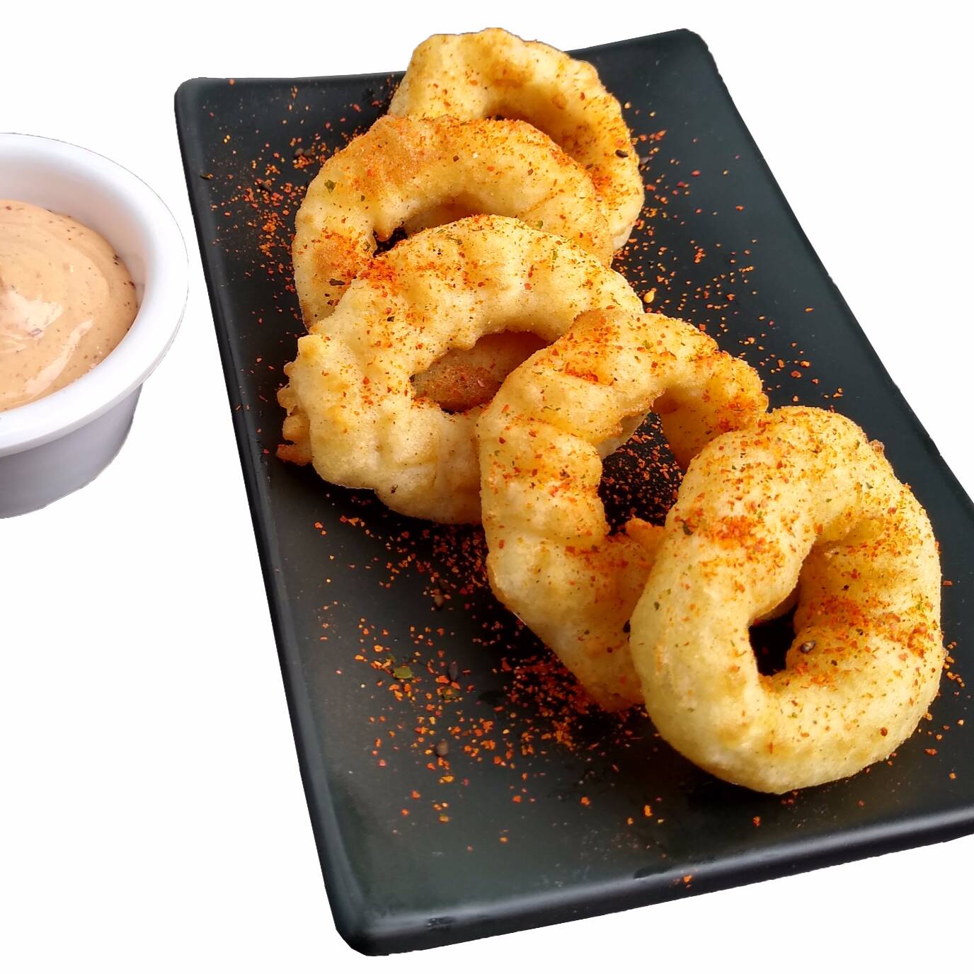 Aros de Calamar al Témpura con salsa chipotle y shishimi 6 pzas