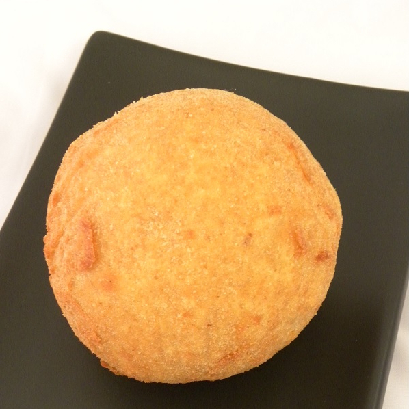 Bola gigante de arroz empanizada y Camarón asado a la japonesa, queso filadelfia, zanahoria rallada, pepino y Salsa baby.