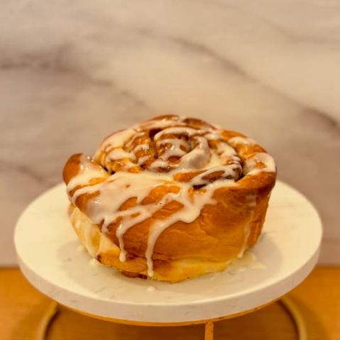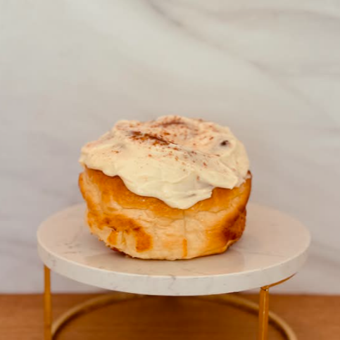 Rol de canela bañado con glaseado de queso crema, dulce y con un toque de vainilla.