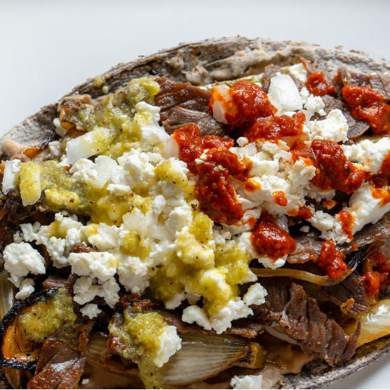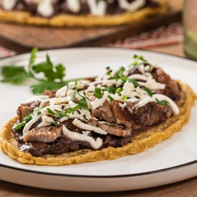 Base de masa de maíz con frijoles negros refritos, cubierta de bistec, lechuga fresca queso y crema, salsa al gusto