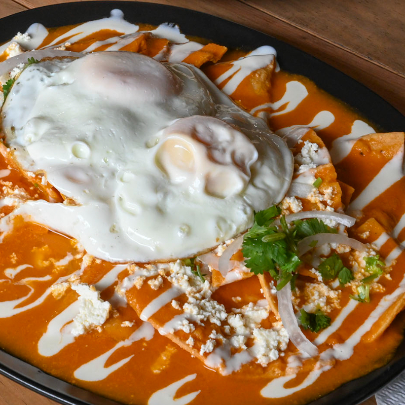 Tortilla de maíz dorada y bañada en salsa verde o roja, servidos con crema, queso fresco y cebolla blanca