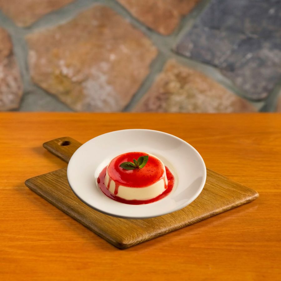 Delicioso postre, hecho a base de crema cocida con sabor vainilla, acompañada en salsa de fresa.