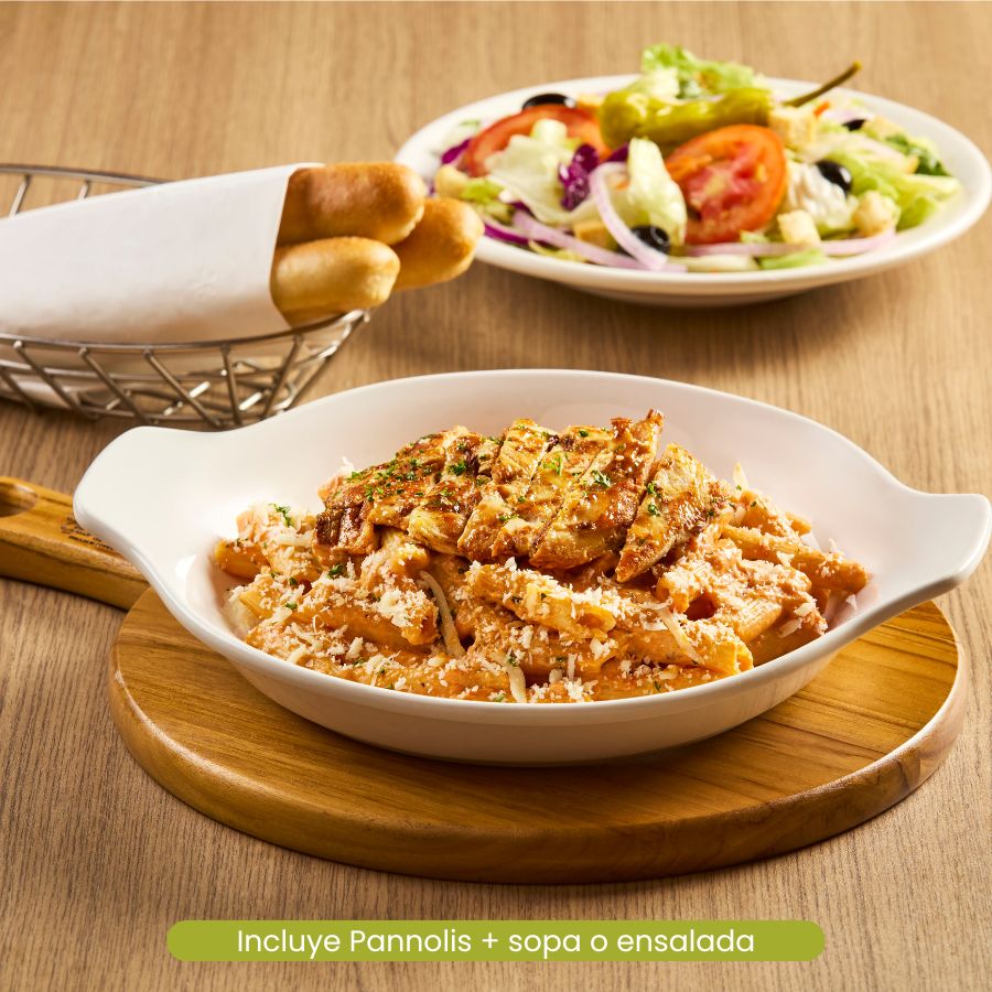 Incluye Panolis + sopa o ensalada. Pasta Penne (236 gr), cubierta con salsa de queso al forno. Acompañada con pollo (114 gr)