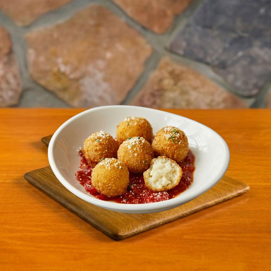 Pequeños bocados de arroz con queso, empanizados y servidos con salsa marinara. (7 pzas, 215 gr)