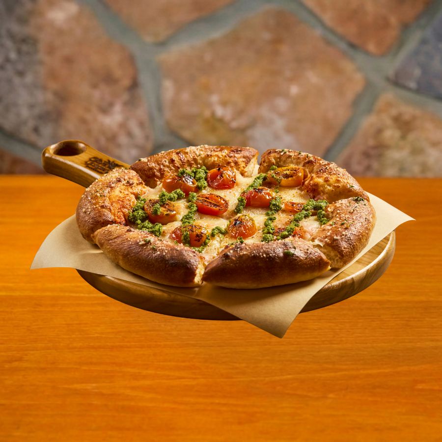 Base de Salsa Marinara con mezcla de quesos italianos, tomate cherry fresco y pesto. (6 porciones, 280 gr de masa)