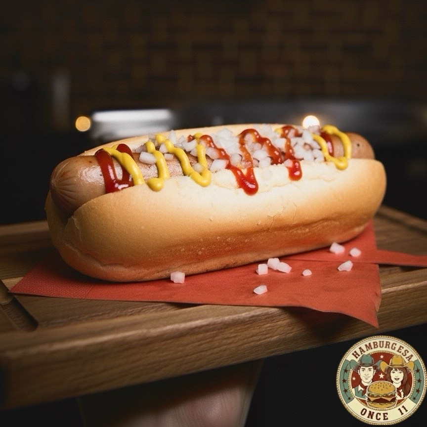 Salchicha, jitomate, cebolla, jalapeño, mayonesa, catsup y mostaza.