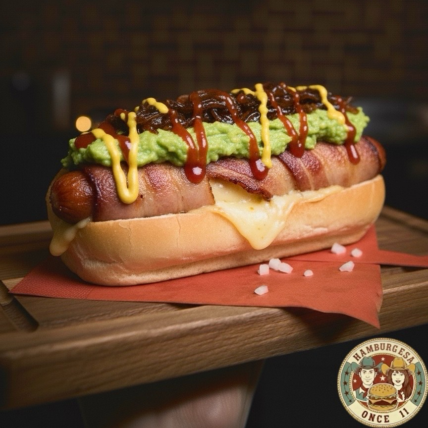 Salchicha rellena de queso manchego envuelta en tocino, guacamole, jitomate, cebolla caramelizada, jalapeño, mayonesa, catsup y mostaza.