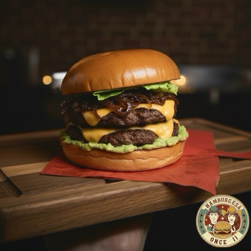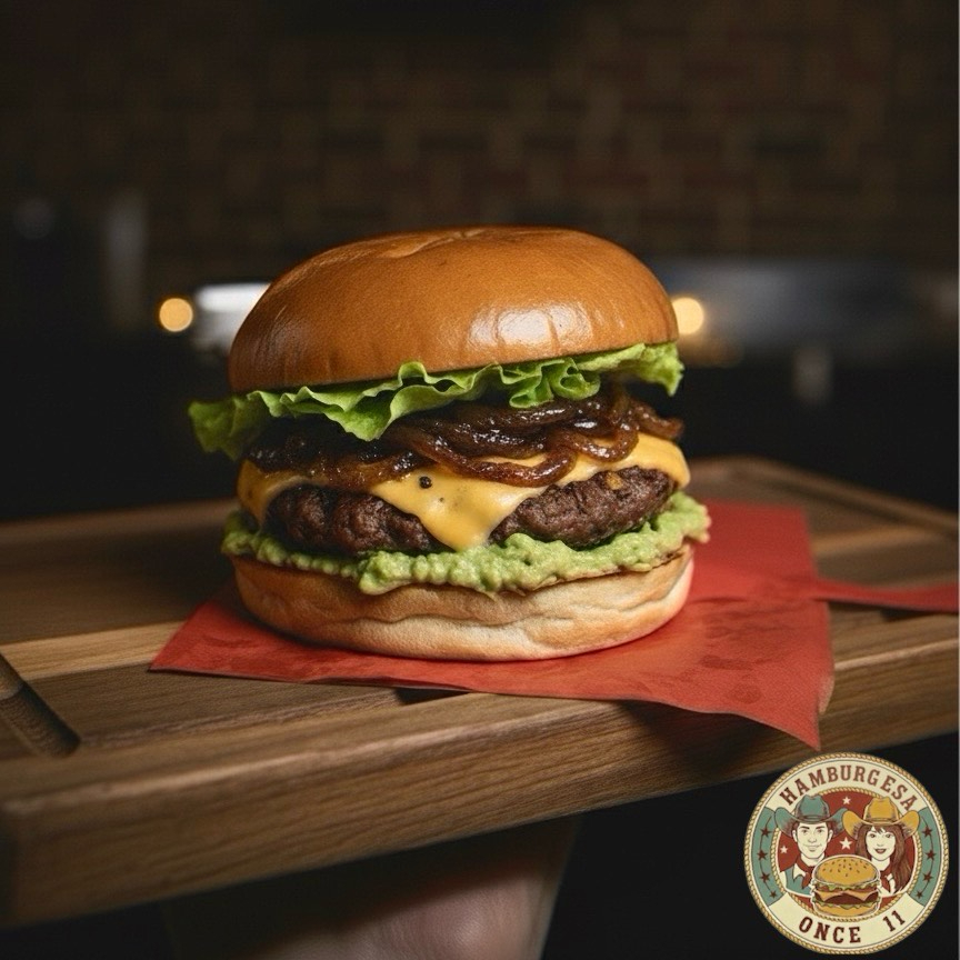 Carne 250gr, queso, guacamole, cebolla caramelizada, jalapeño, aderezo de la casa.