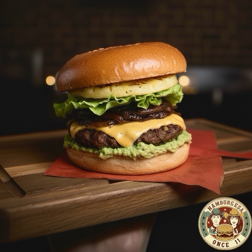 Carne 150gr, jamón, piña, queso, lechuga, pepinillos, guacamole, cebolla caramelizada, jitomate y jalapeño.
